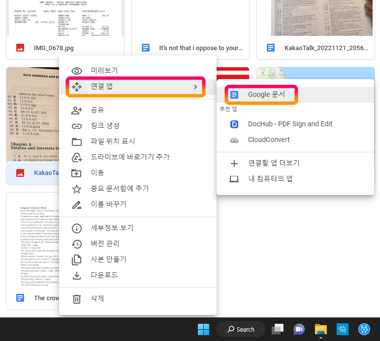문자(텍스트)가 포함된 사진을 구글 드라이브에 업로드 시킨후 구글 Doc으로 여는 작업만으로 결과를 얻을 수 있습니다.