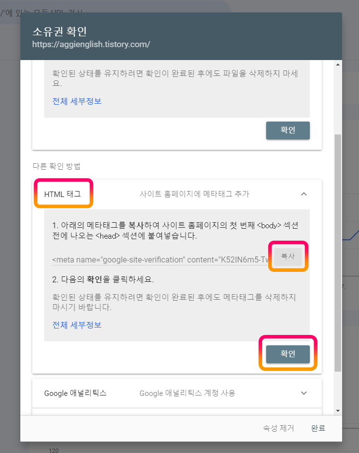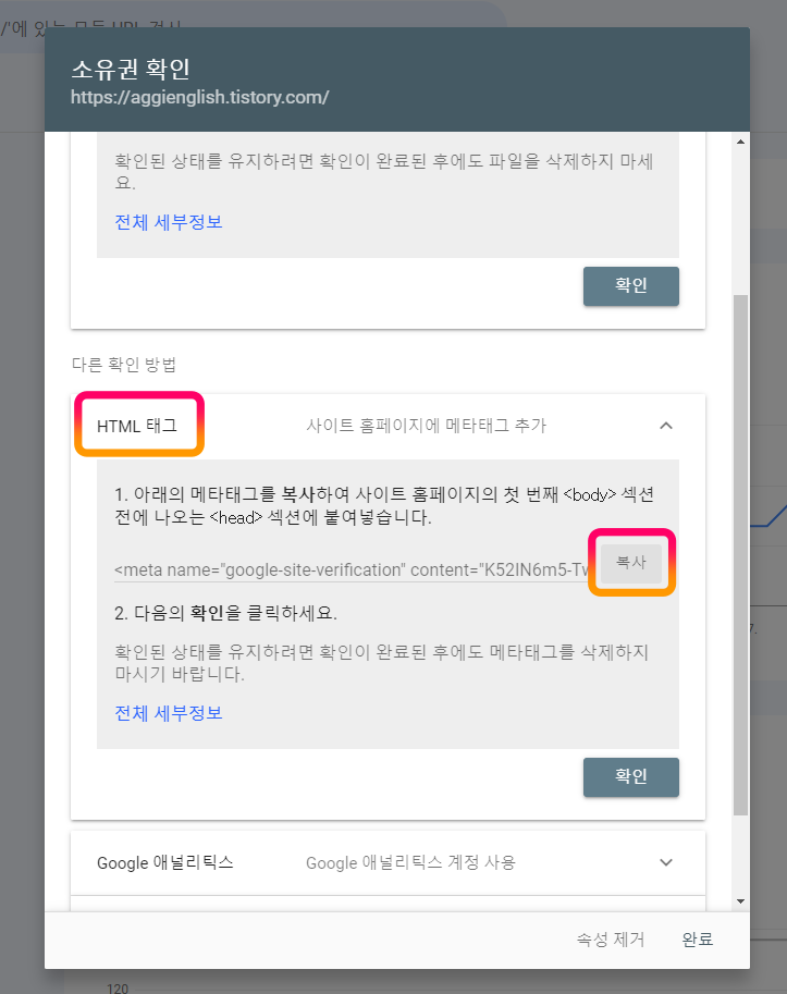1-3. 소유권 확인 화면에서 "HTML 태그"를 선택한 후 "복사"를 클릭 합니다.
