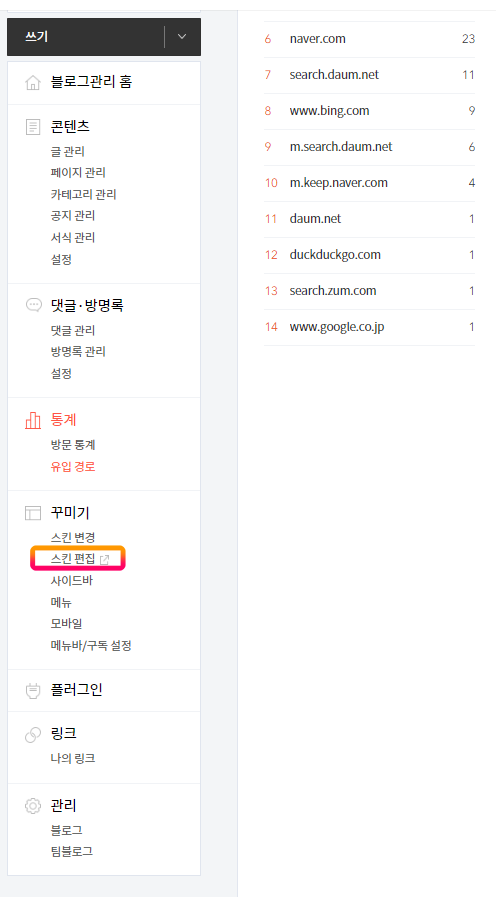 1-4. 티스토리 관리자 화면에서 "스킨편집"을 선택합니다.