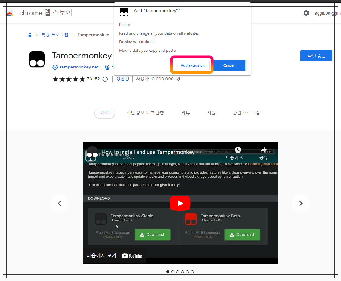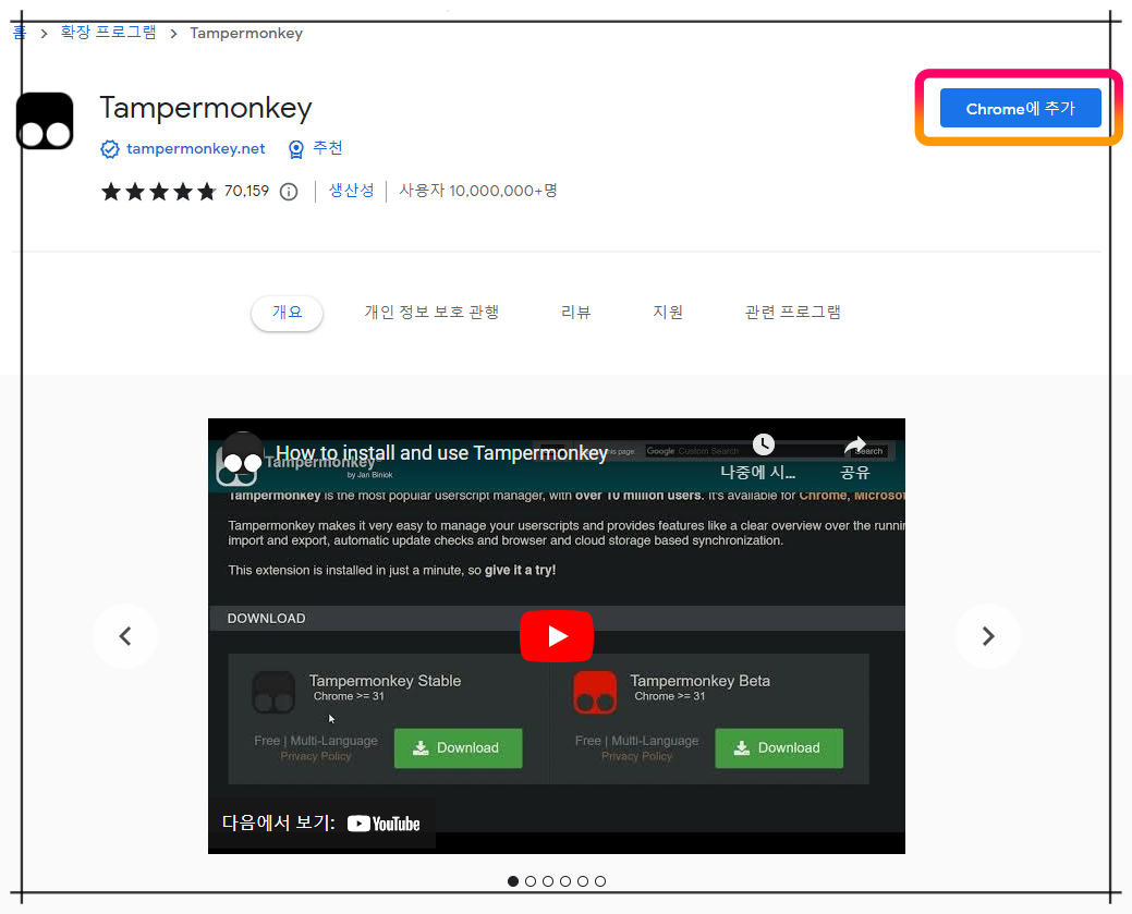 유튜브 동영상 다운로드용 Tampermonkey 설치방법