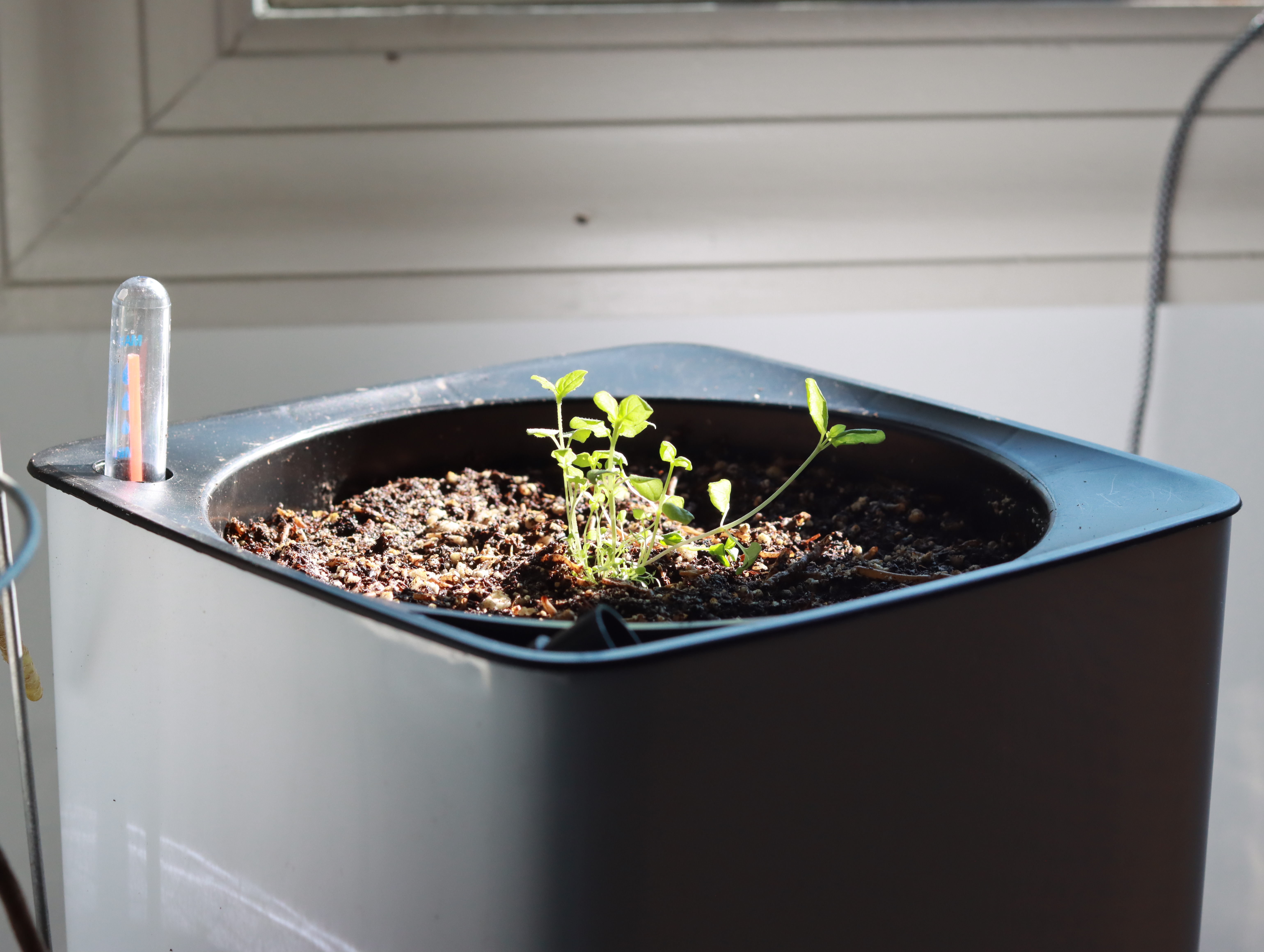옮겨 심은 화분은 잔량의 물이 표시되는 화분입니다, 눈금이 내려가면 물을 보충해 주면 되니 편할 것 같아 주문하였는데 저도 처음 사용해 보는 것이라 성능? 에 관해선 뭐라 드릴 말씀이 없네요...