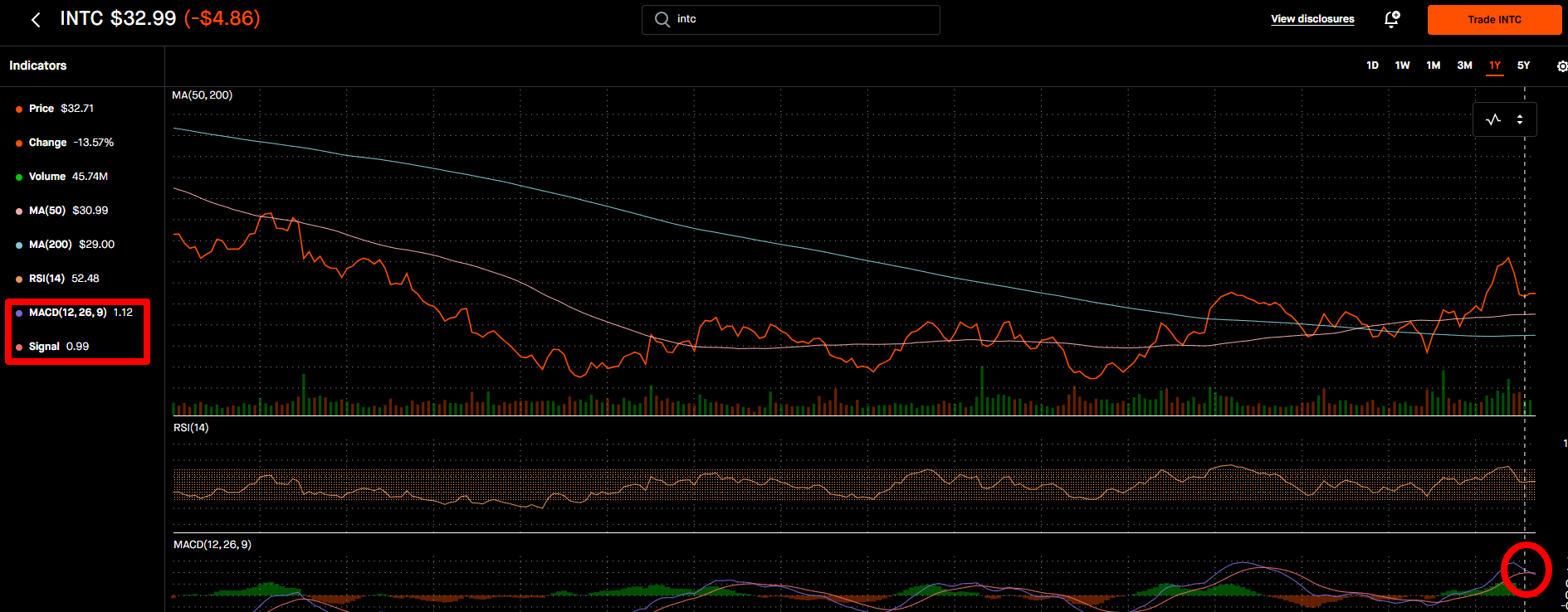 INTC는 1달 보유했던 종목인데 MACD시그널 하락을 보고 전량 매도 하였습니다.
