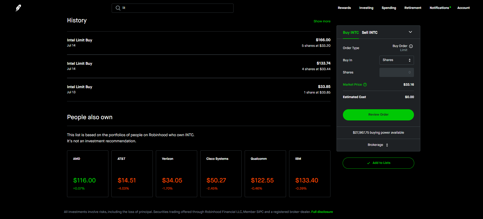 인텔입니다, +3%의 저조한 수익을 얻은 후 6월 전량 매도한 종목이었는데, MACD 반전신호 직전에 신규 매수한 하였습니다. 지난 금요일 추가 하락하며 MACD 반전에도 실패하였습니다. 돌아오는 주 MACD의 신호의 반전 여부에 따라 손절 또는 추가 매수를 결정하려 합니다. 불안한 마음에 10주만 매수한 것이 어떻게 적용될지 지켜보는 재미가? 있을 것 같습니다.