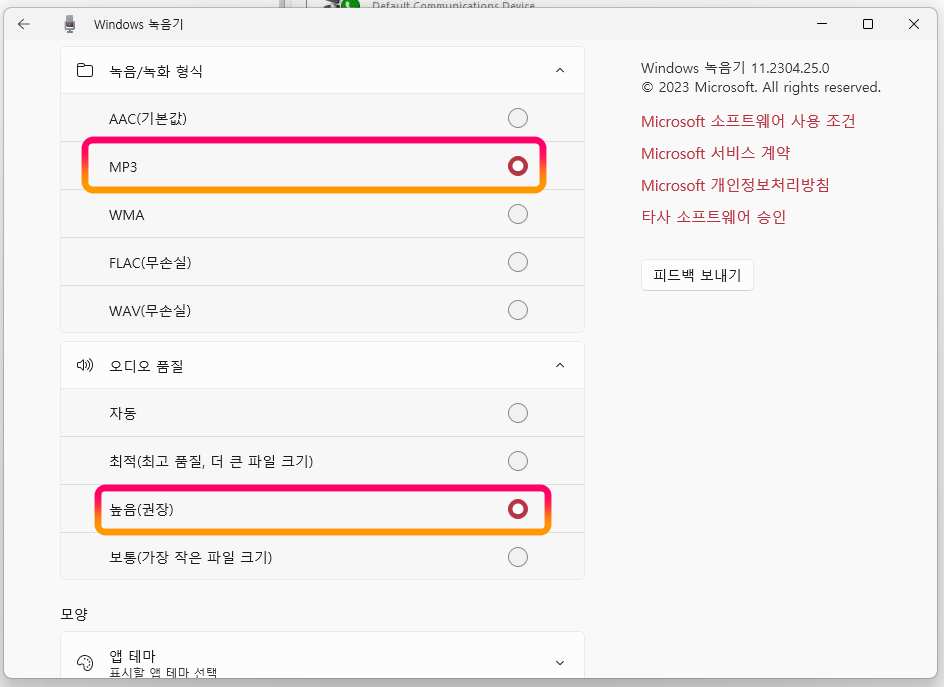 "설정"에서 원하시는 "녹음 형식"과 "오디오 품질"을 선택하세요. 저의 경우 mp3 파일 형식과 권장하는 오디오 품질 높음을 선택하였습니다.