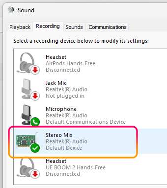 Stereo Mix가 활성화되어 있어야 합니다. 시스템의 사운드 모드 "input"에서 Microphone(기본)을 Stereo Mix로 변경해 주세요.