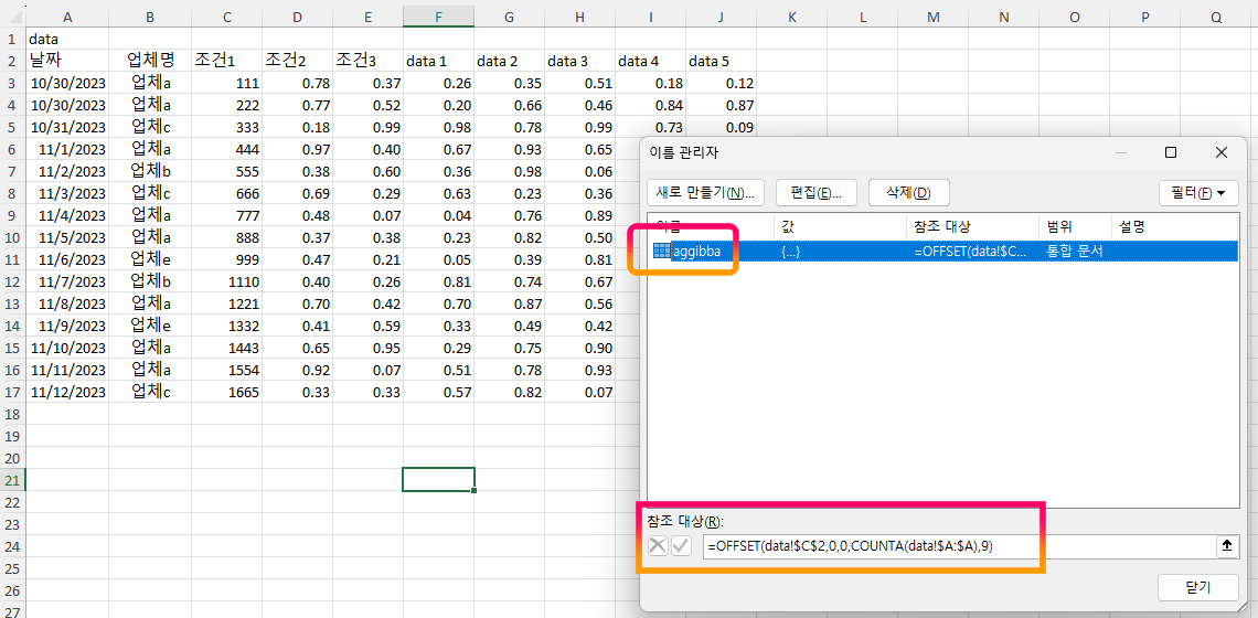 처음? 보는 함수 "OFFSET"과 "COUNTA"가 보이네요... 별것 없습니다. 미리 겁먹지 마세요.
