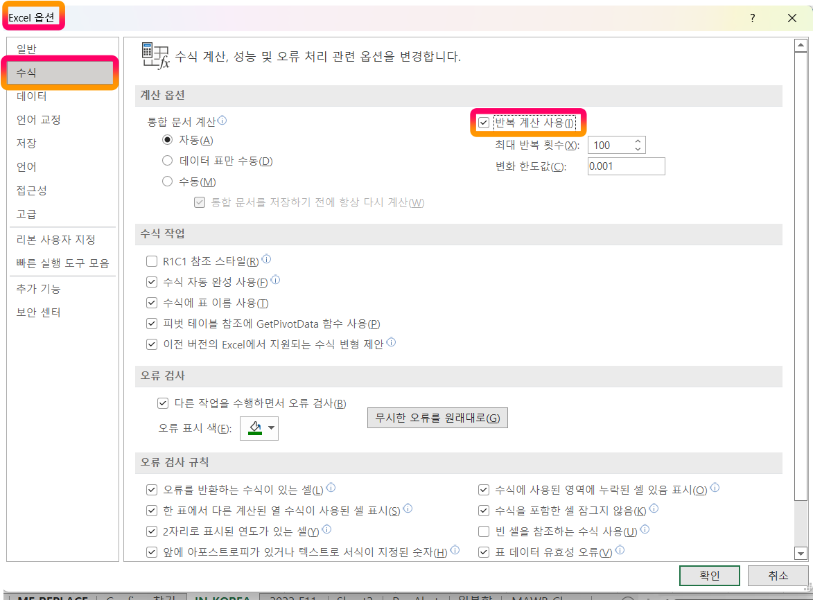 단 이와 같이 반복 계산이 필요한 경우 [Excel 옵션] [수식] [반복 계산 사용]을 활성화해주어야 합니다.