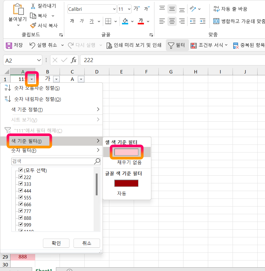 6 [필터] [색 기준 필터] [셀 색 기준 필터]를 눌러 아래와 같은 결과 값을 얻을 수 있습니다.