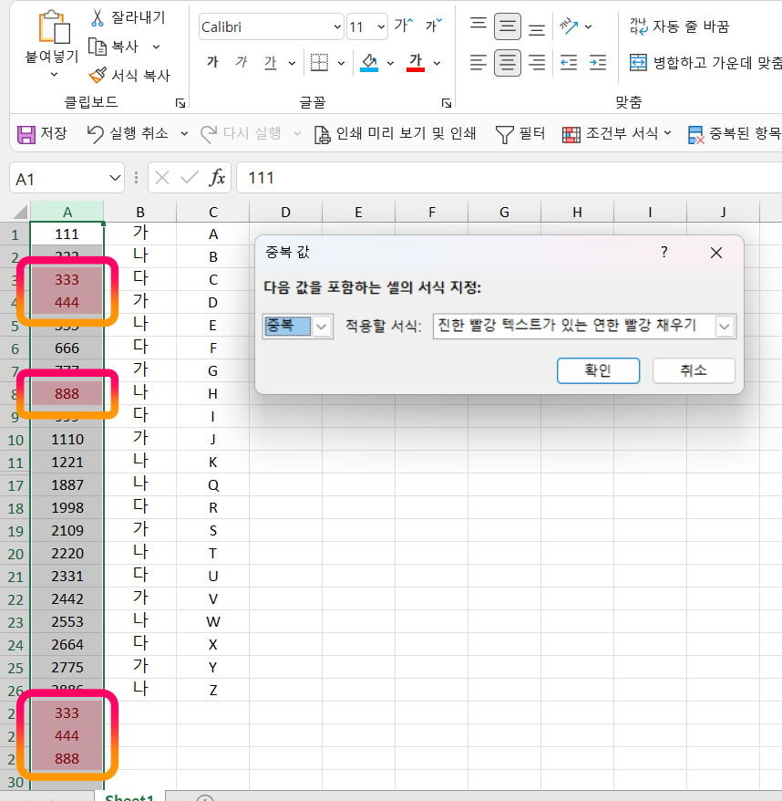 엑셀에서 중복값 찾기