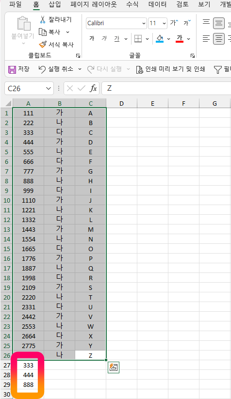예제 1과 같이 수많은 DATA가 있다고 가정하고 그중 "333", "444", "555"에 해당하는 DATA를 추출해 보겠습니다.