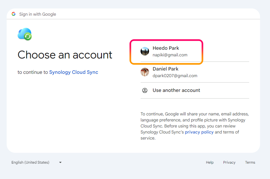 3. Google 계정선택하고 화면의 안내에 따라 진행합니다.