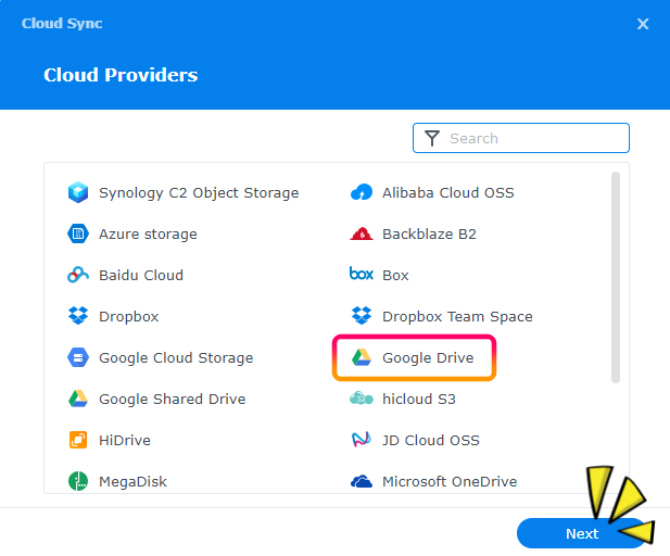 2. NAS에서 지원하는 여러 프로그램들의 List가 보이네요, "Google Drive"를 선택하고 "Next"