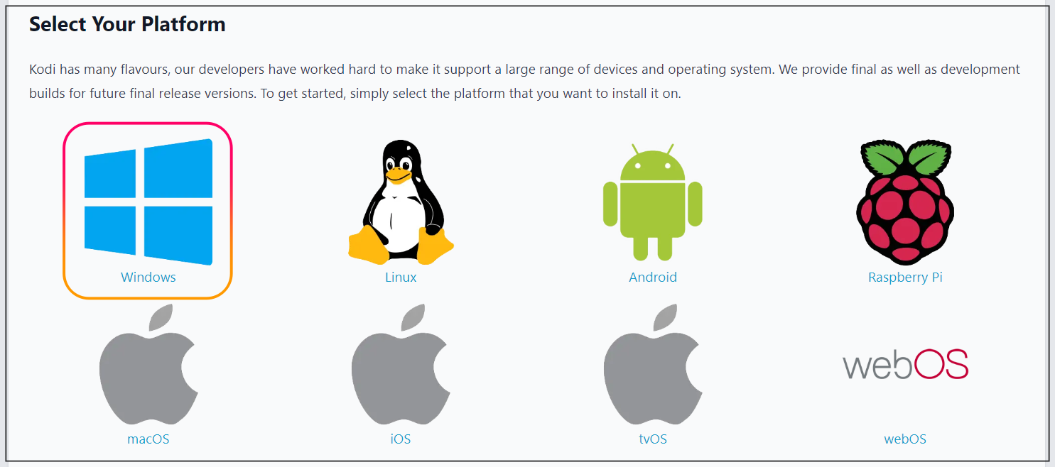 kodi.tv/download에 접속 후 windows용 파일을 다운로드 후 설치합니다.