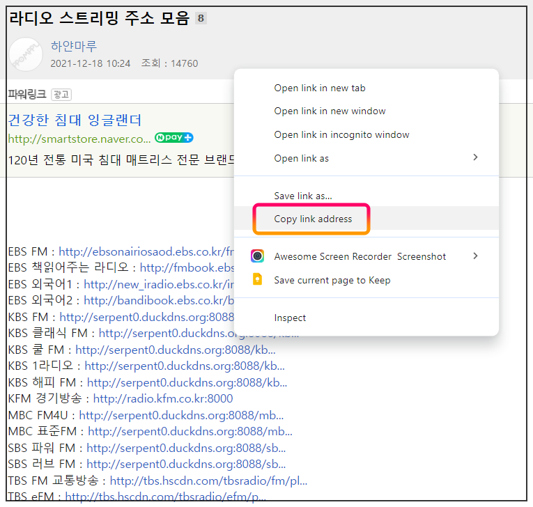 라디오 스트리밍 주소는 구글 검색으로 쉽게 얻을 수 있습니다.