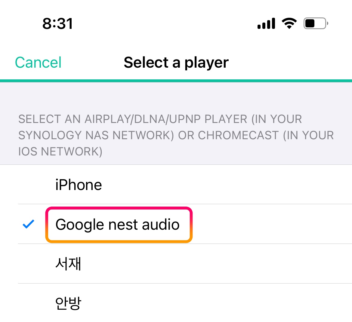 아래 그림의 경우 거실에 설치된 Google Nest Audio로 재생 중인 예입니다.