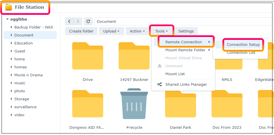 1. NAS의 "File Station" - "Tools" - "Remote Connection" - "Connection Setup"을 차례로 선택합니다.