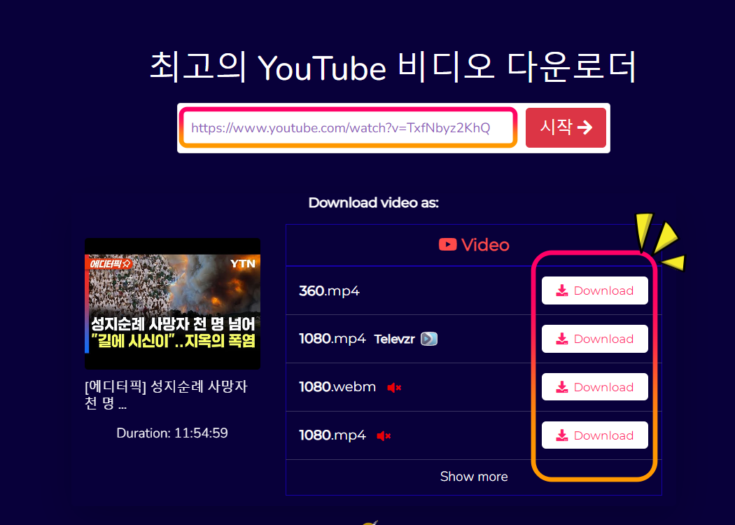 유튜브 영상 주소를 입력하면 종류별 다운로드 가능한 버튼이 생성됩니다.