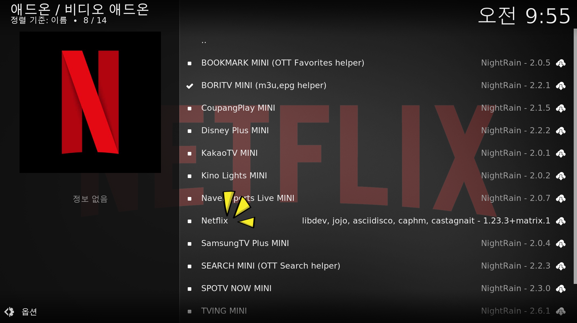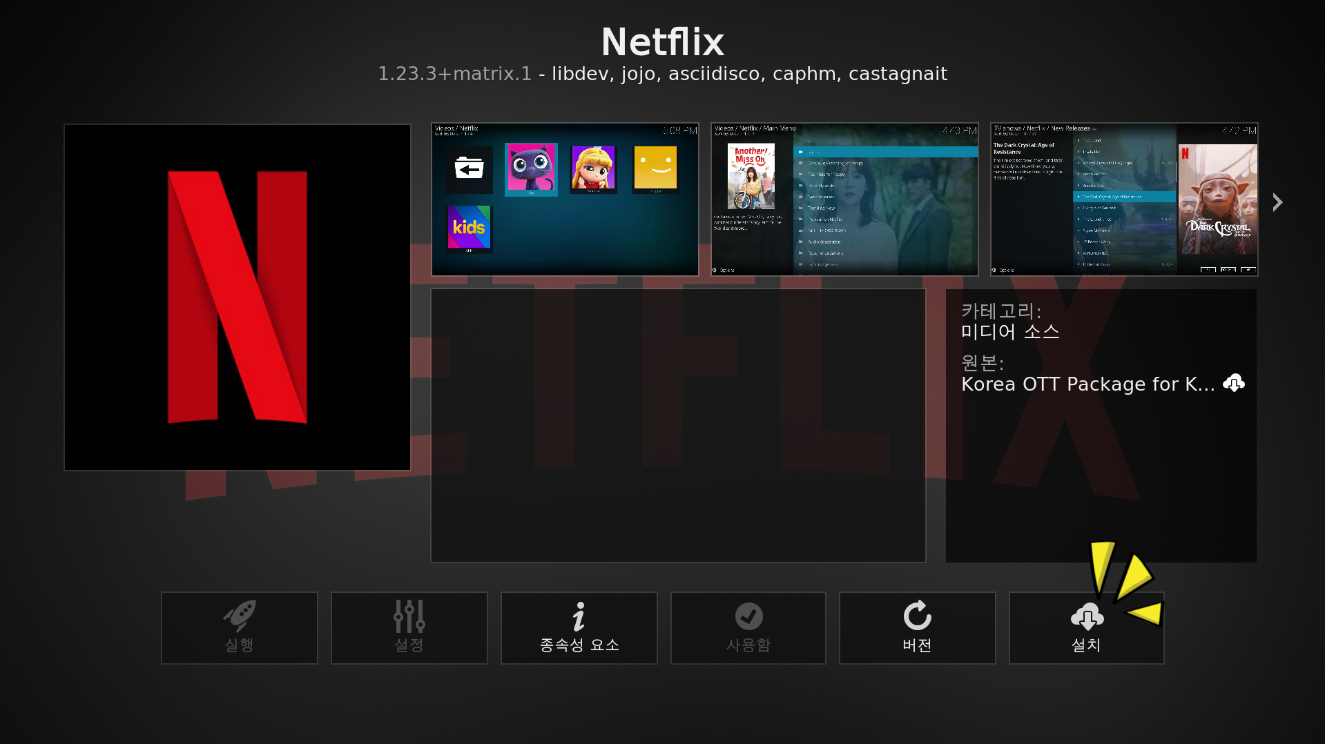 각 채널 설치) "애드온" - "저장소에서 설치" - "Korea OTT..... zip" - "비디오 애드온" - "원하는 채널 설치"
