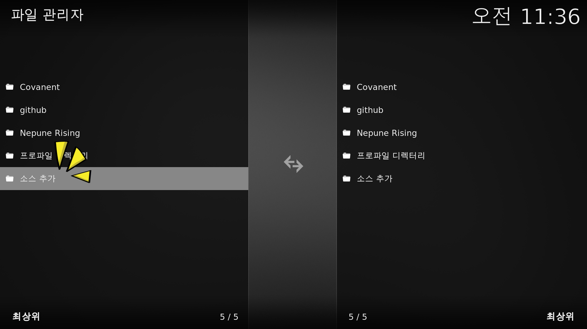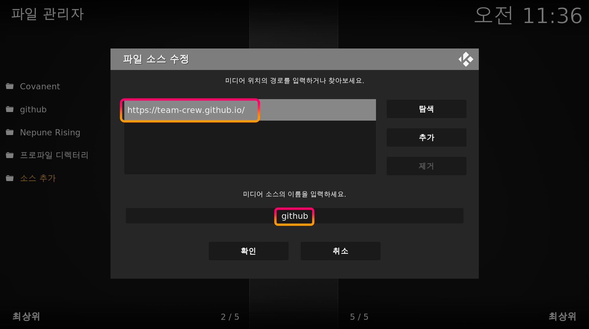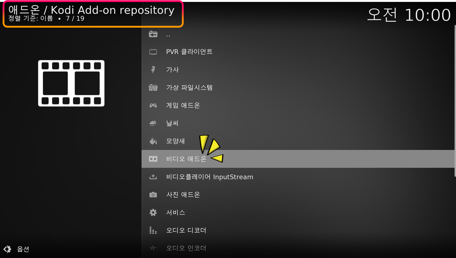 KODI는 단순한 플레이어이기에 여기서 동작할 소스를 연결하는 작업이 필요합니다.