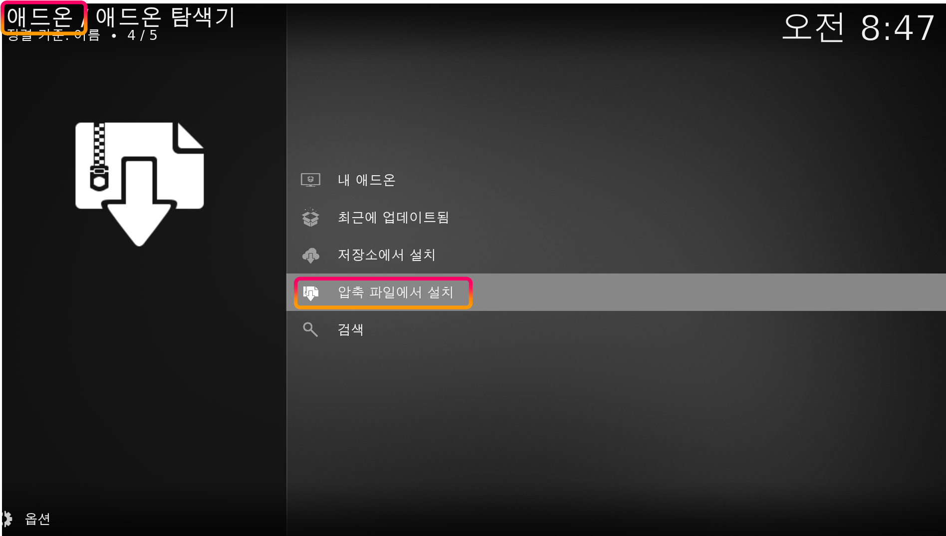 KODI) "애드온" - "압축파일에서 설치" - "파일선택" -"실행"