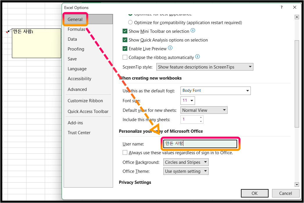 엑셀 기능 중 메모에 관련하여 자동으로 지정된 Install시 입력된 사용자 이름 변경과 메모 옵션(색상이나 글꼴) 변경하는 방법에 관하여 포스팅하겠습니다.