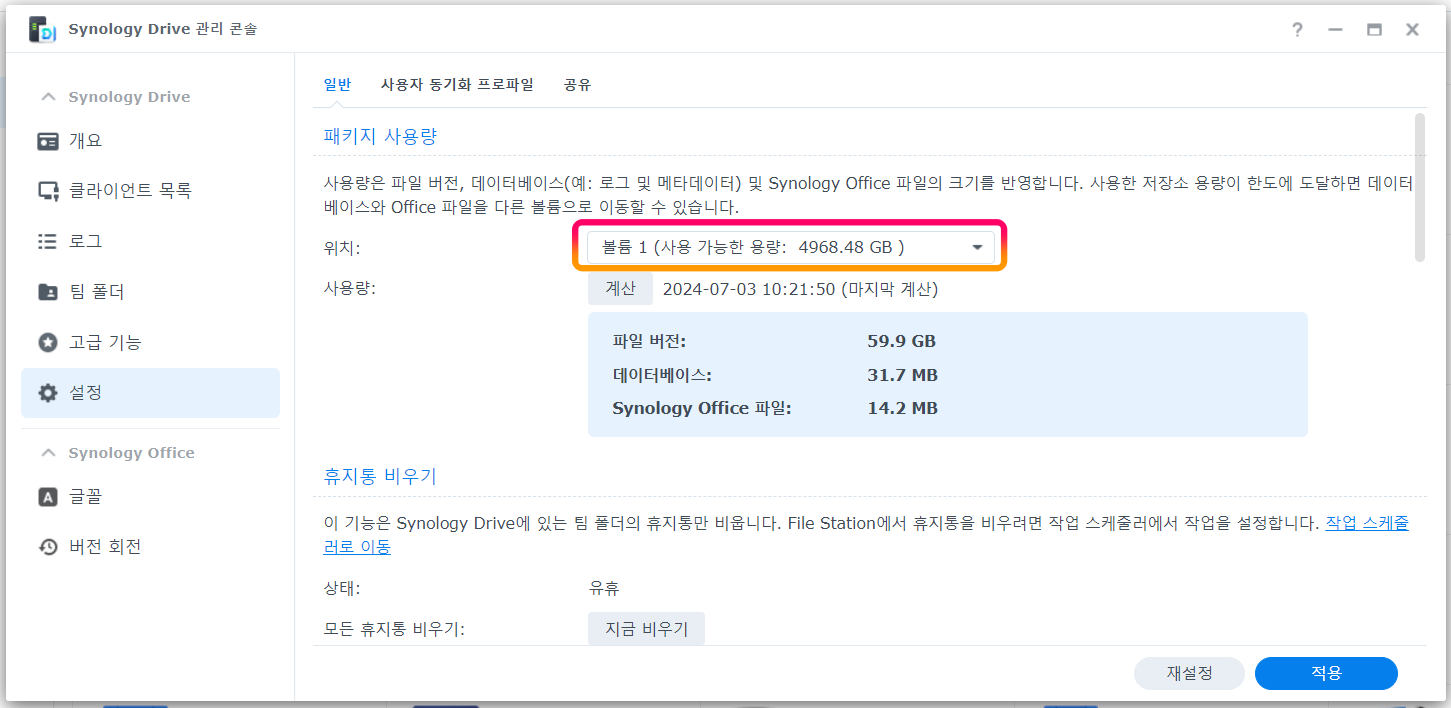 저의 경우 Synology Drive에서 사용가능한 용량이 4,968G라고 표시되네요 ^^