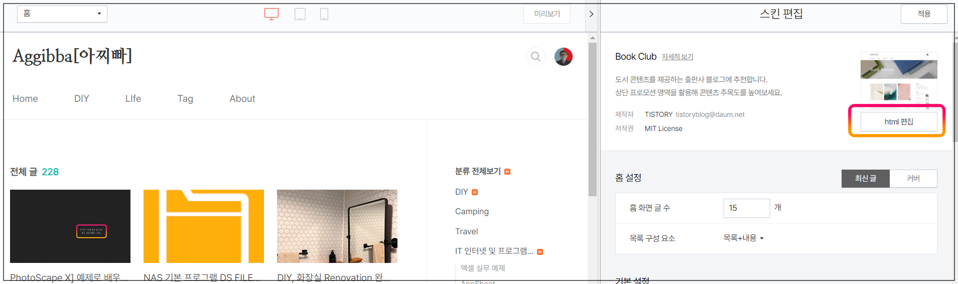 1. "설정" > "꾸미기" > "스킨편집" > "html편집" 을 선택합니다.