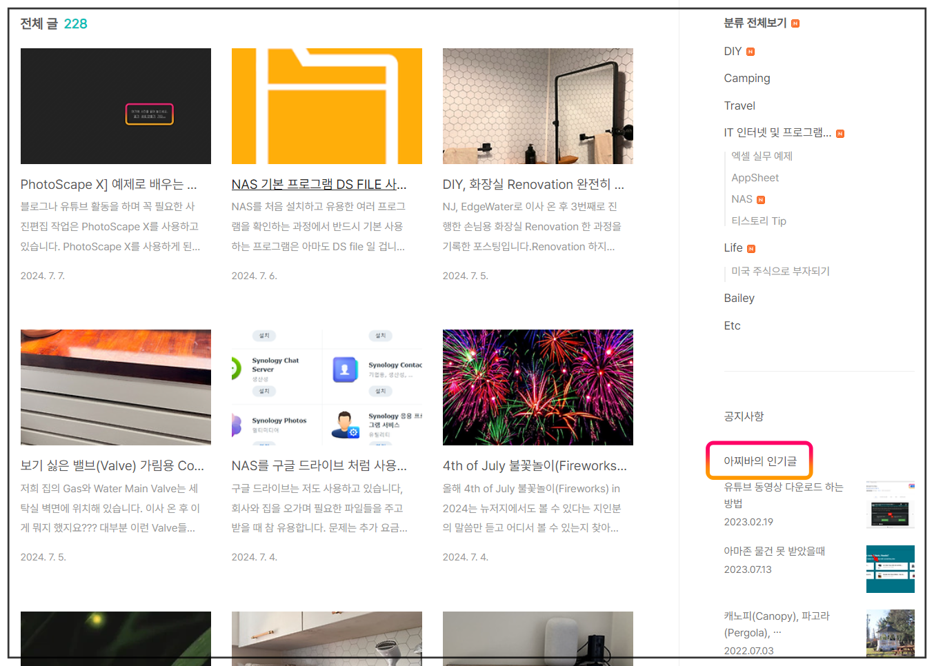 최신글과 내용이 삭제되고 인기글이 "아찌빠의 인기글"로 변경된 것을 확인할 수 있습니다.