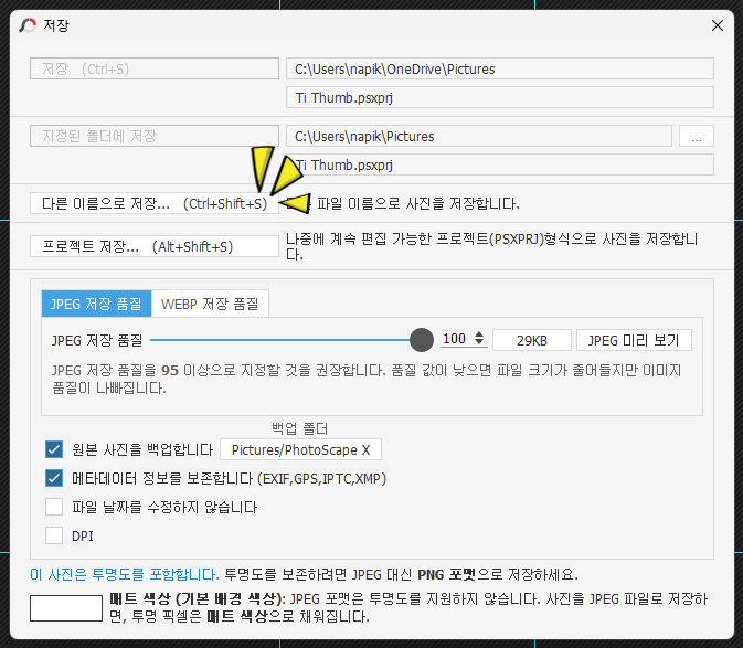 저장 시 "다른 이름으로 저장..." > "*. png"로 저장하면 투명이미지가 보이지 않는 썸네일 이미지가 만들어집니다.