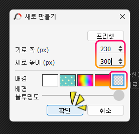 "새로 만들기" > 가로 세로 "230 x 300" > "배경 없음"을 선택 후 "확인"을 눌러줍니다.