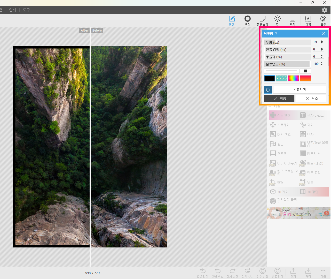 "편집" > "변형" > "테두리 선" 에서 두께, 안쪽 여백 등의 옵션을 변경하여 원하는 결과물을 만들 수 있습니다.