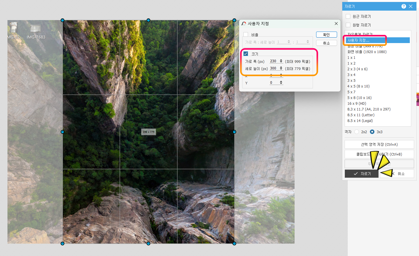 "편집" > "자르기" > "사용자 지정" > "크기"에서 원하는 사이즈를 입력하여 작업할 수 있습니다.