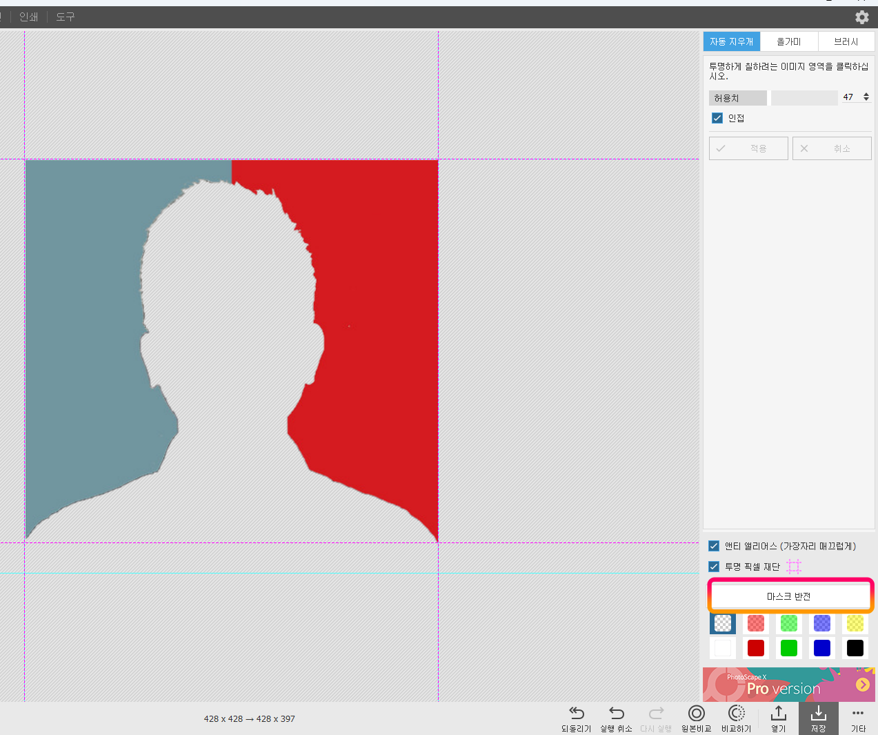 "마스크 반전" 기능은 지운화면과 지우지 않은 화면이 반전되는 효과입니다. 넓은 배경에 조그마한 사물만 남기고 싶을 때 사물을 지우고 마스크 반전을 이용하면 넓은 범위를 일일이 지울 필요가 없습니다.