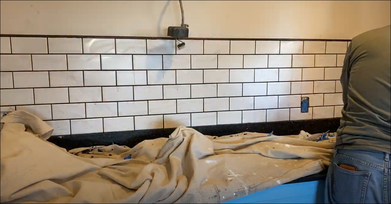 상부장을 뜯어낸 자리를 매끈하게 정리 후 페인트를 칠한 후 타일을 붙여 줍니다.