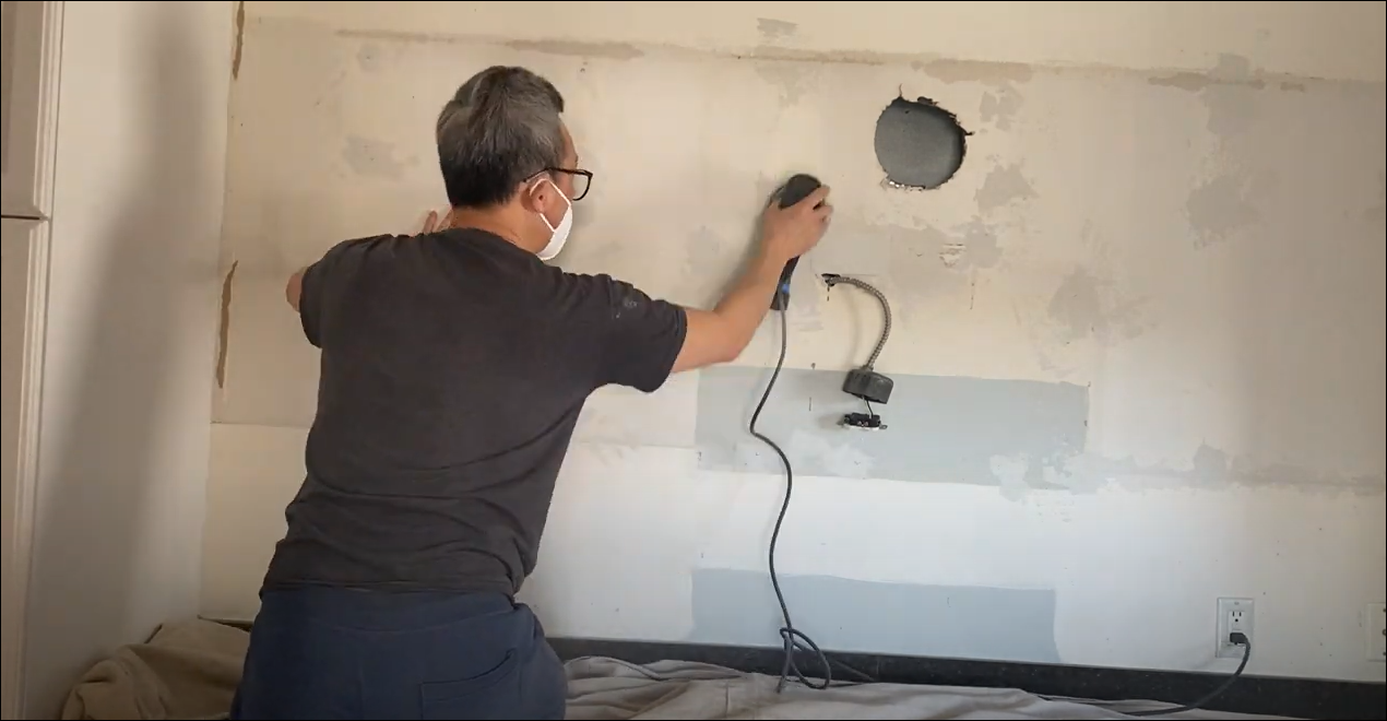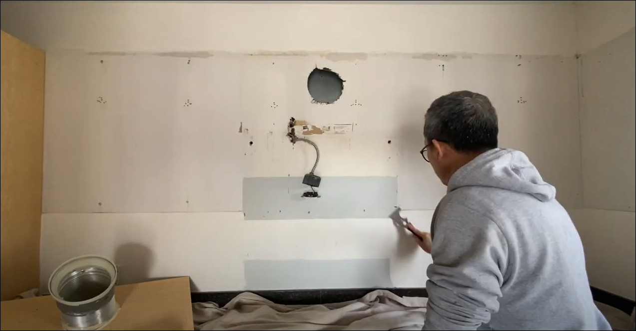 상부장을 뜯어낸 자리에 생긴 구멍을 Drywall patch을 사용하여 수리해 줍니다.