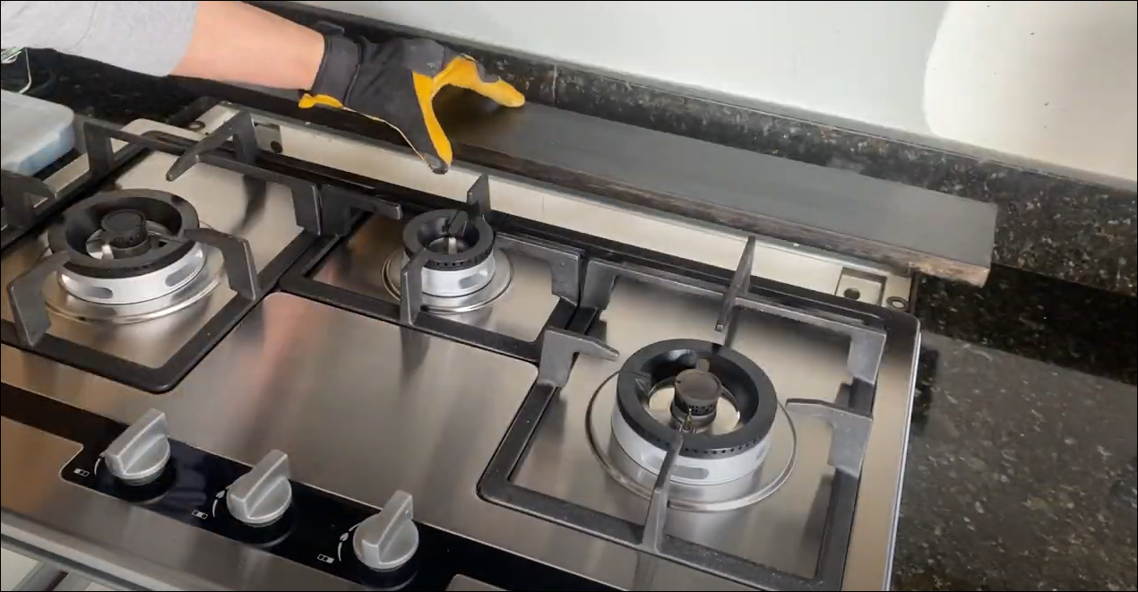 오븐을 변경하며 어쩔 수 없이 생기는 빈틈은 나무를 제단 한 후 스테인 칠과 코팅으로 만들었습니다.