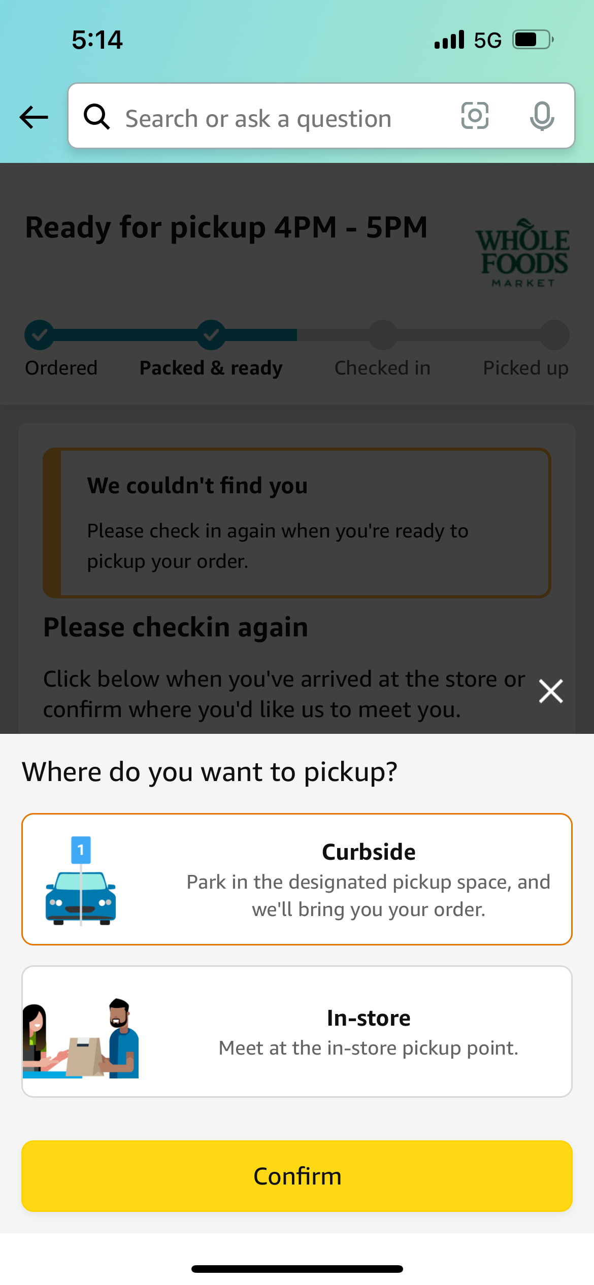 매장 도착 10분전 알림을 달라는 메시지에 응답 후 혹시나 늦을 것을 대비하여 "In-Store"를 선택했습니다. 참고로 "curbside"는 지정된 주차공간에서 기다리면 차량에 짐을 실어주는 서비스입니다.