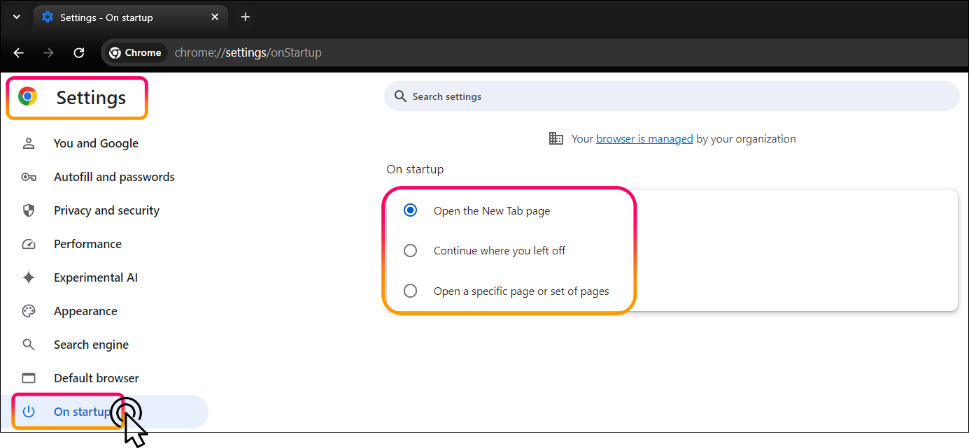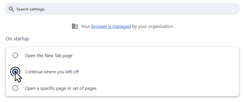 On Startup의 3가지 메뉴중 현재 "Open the New Tab page" 대신 "Open a specific page or set of pages"를 선택합니다.