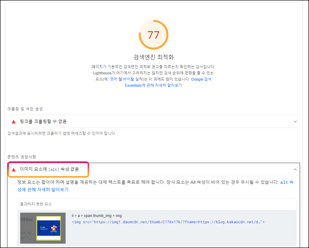 지난 시간 Google Lighthouse 검토 결과 "검색엔진 최적화" 점수가 낮은 이유의 대부분이 대표 그림 속성에 alt 속성이 없다는 분석결과를 받았습니다.
