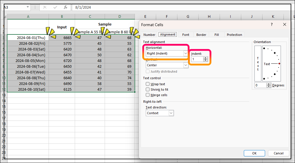 범위 선택 > "Format Cells" > "오른쪽 정렬" > "들여쓰기(Indent)"