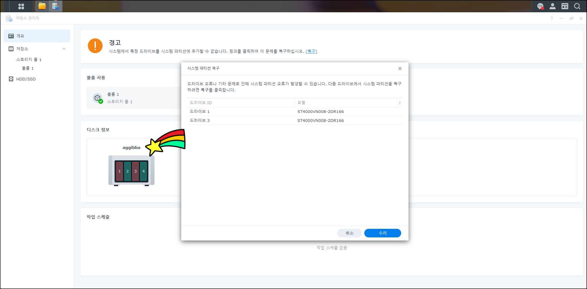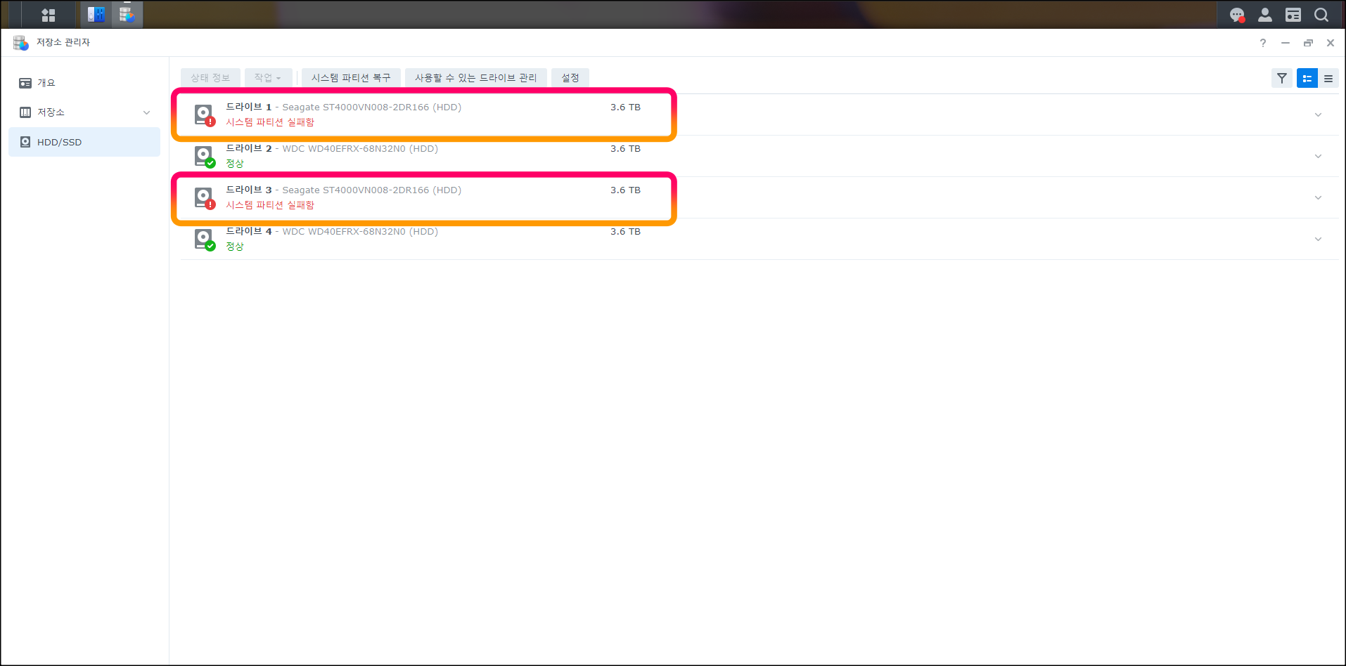 1번, 3번 드라이브가 잘못되었다는 메시지가 표시됩니다.
