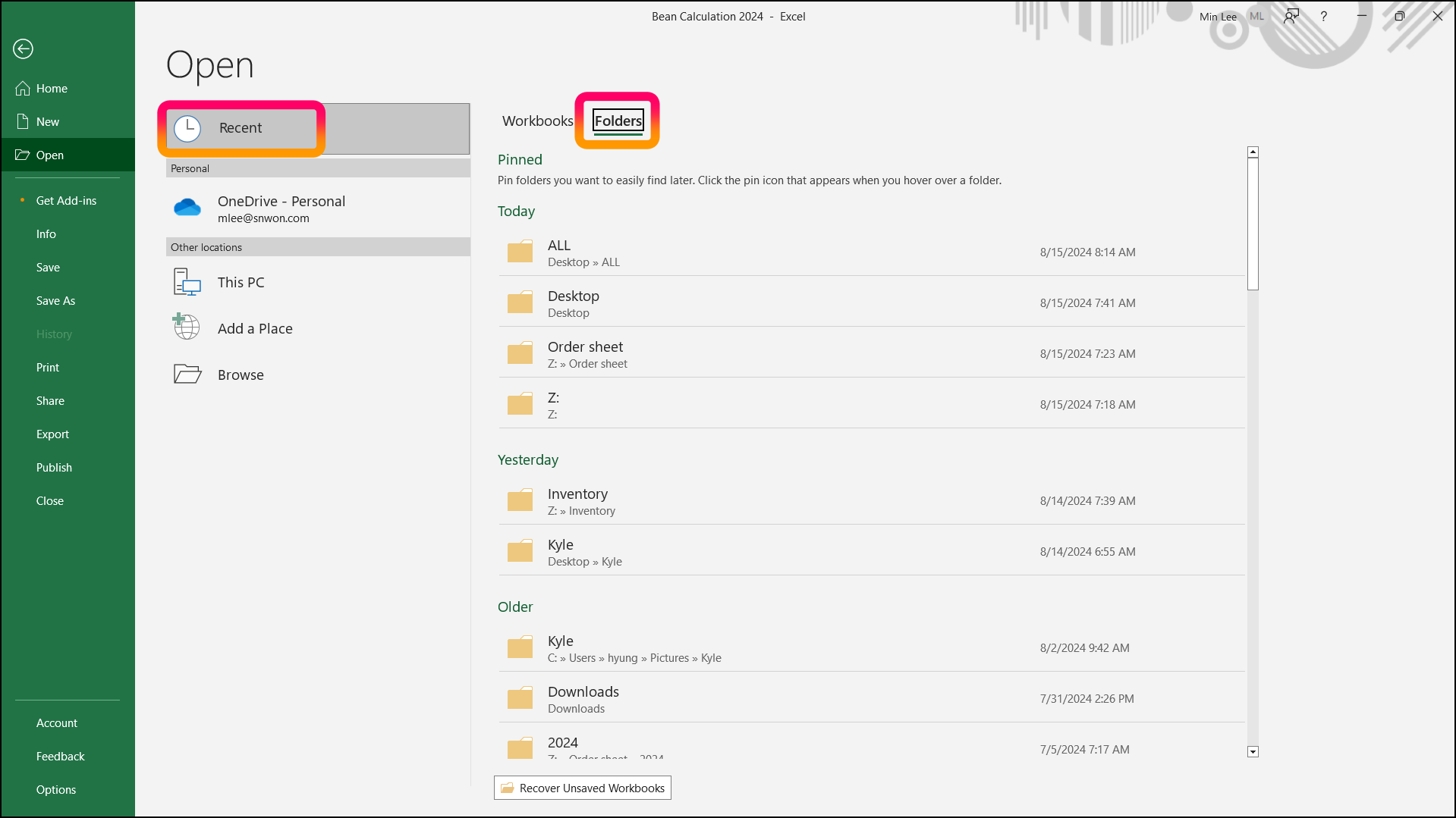 "File" > "Home" > "Recent"
