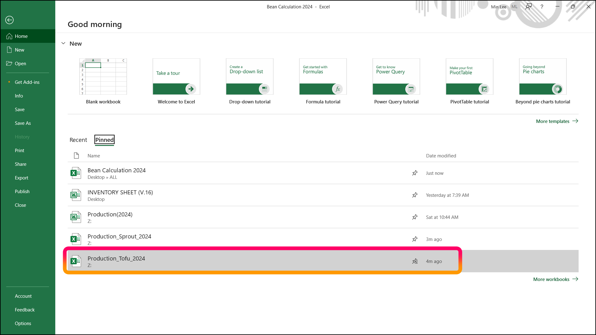 "File" > "Open" > "Workbooks"