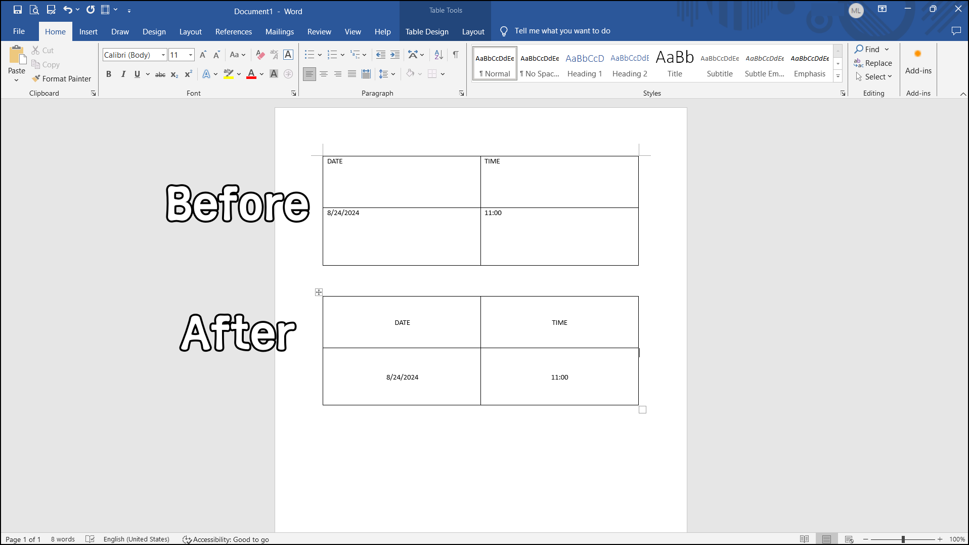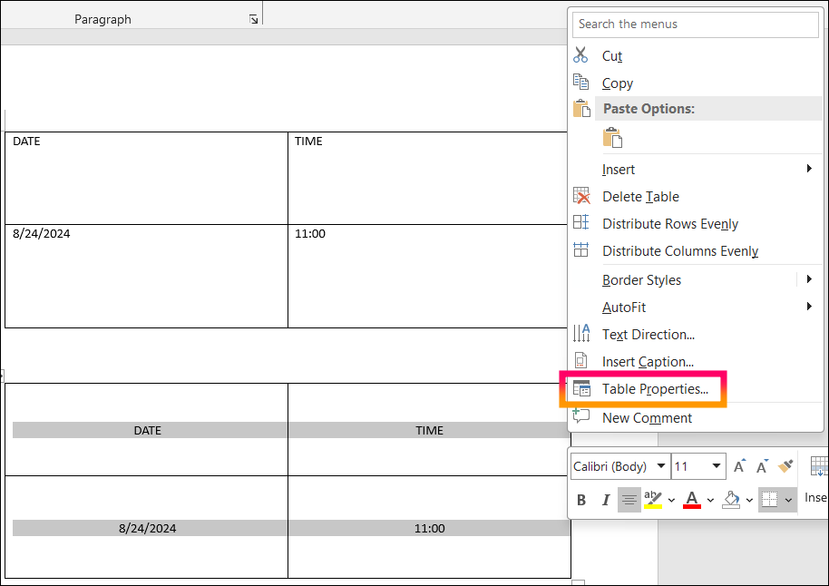 텍스트가 들어간 셀 선택 > 마우스 오른쪽 클릭 > "Table Properties" > "Cell" > "Center"