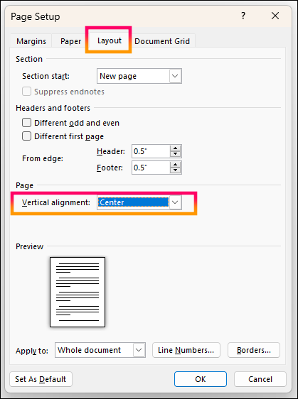 "Layout" > "페이지 섹션" > "Layout" > "Vertical alignment" > "Center"