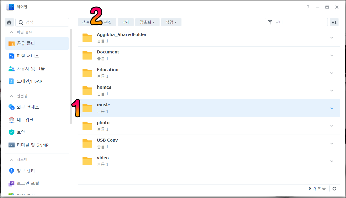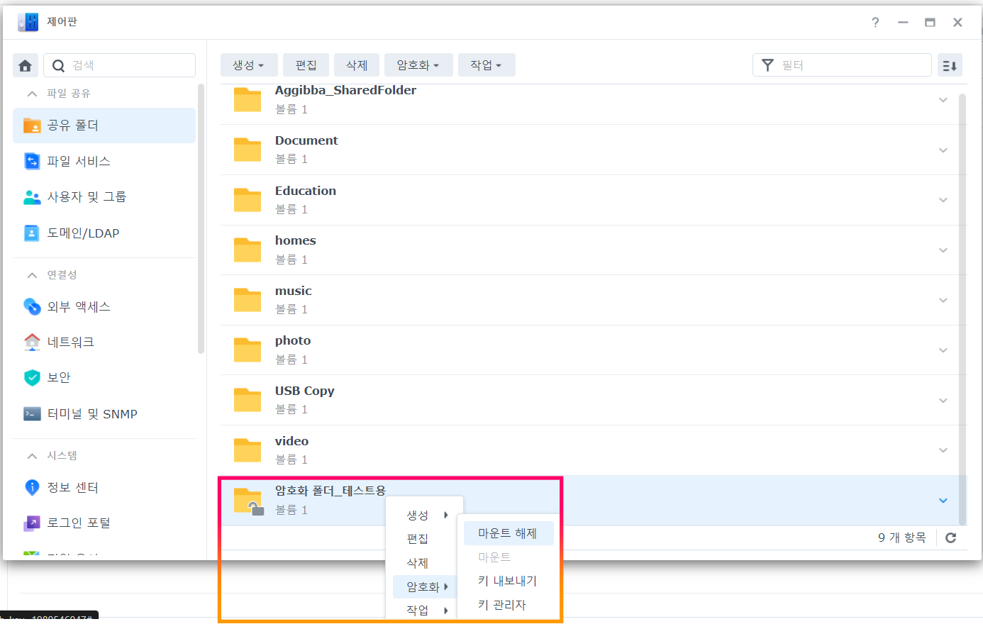 "제어판" > "공유폴더" > "해당 폴더선택" > "편집" > "암호화"