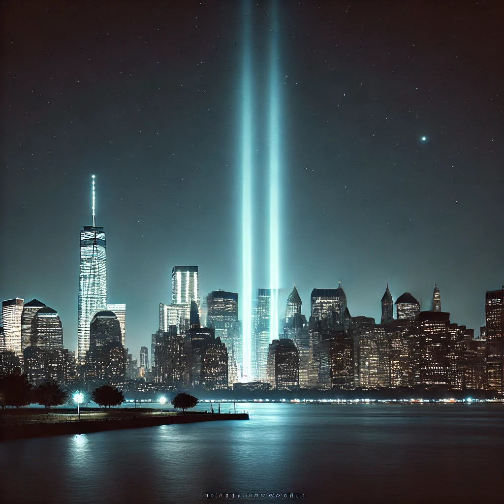 두 줄기의 거대한 빛 기둥이 무너진 세계 무역 센터(WTC) 쌍둥이 빌딩을 상징하며 하늘을 향해 쏘아 올려는 겁니다.