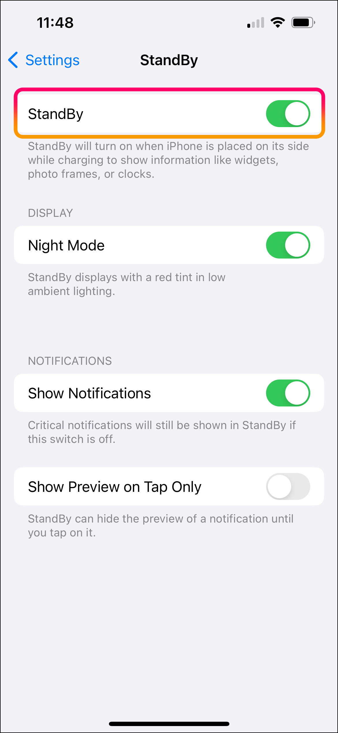 iOS 17이후 버전에서 "Settings" > "StandBy"에서 StandBy를 활성화해 주시면 됩니다.