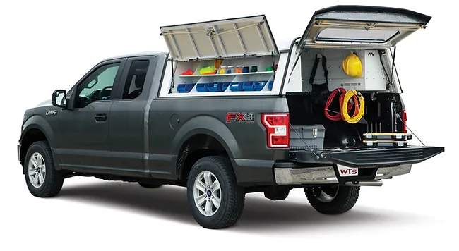 트럭 베드 캡 내부에 슬라이딩 트랙 시스템을 갖춘 형태로, 적재물을 쉽게 넣고 꺼낼 수 있도록 설계되었습니다.