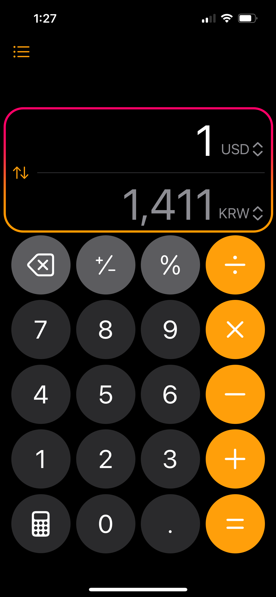 Convert 기능은 아이폰의 계산기 앱에서 길이, 무게, 환율, 온도.... 등을 원하는 값으로 변환해 주는 기능입니다.